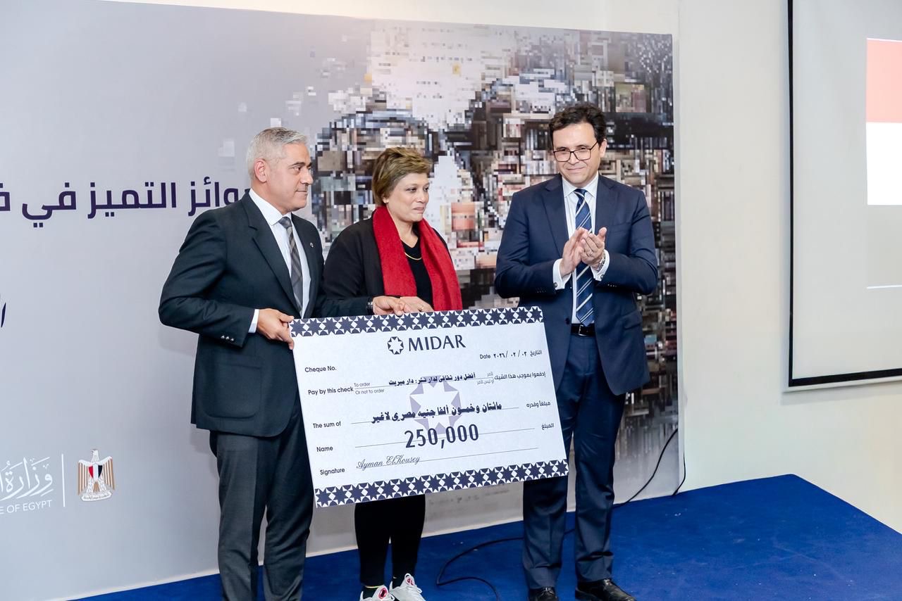 وخلال الحفل، قام الدكتور أحمد هنو، وزير الثقافة، وممثلاً عن المهندس أيمن القوصي، العضو المنتدب والرئيس التنفيذي لشركة ميدار عزت دنيا رئيس القطاع الإداري للشركة، بتسليم الجوائز للمشاركين، في إطار رؤية “ميدار” لدعم الثقافة والمعرفة، وتأكيدًا على دورها كنموذج لمشاركة القطاع الخاص في دعم الفعاليات الثقافية الكبرى بالدولة، بما يتوافق مع رؤية “ميدار” الإستراتيجية وإلتزامها بالتنمية الشاملة، التي تجمع بين تطوير المدن المتكاملة وتنمية الإنسان ثقافيًا ومعرفيًا.